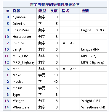 執行後在結果中我們可以找到如下表格,可以用來確認所有變數的屬性:(自動依照資料表擁有屬性列出)