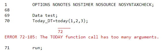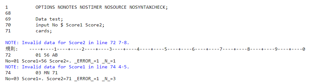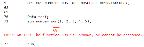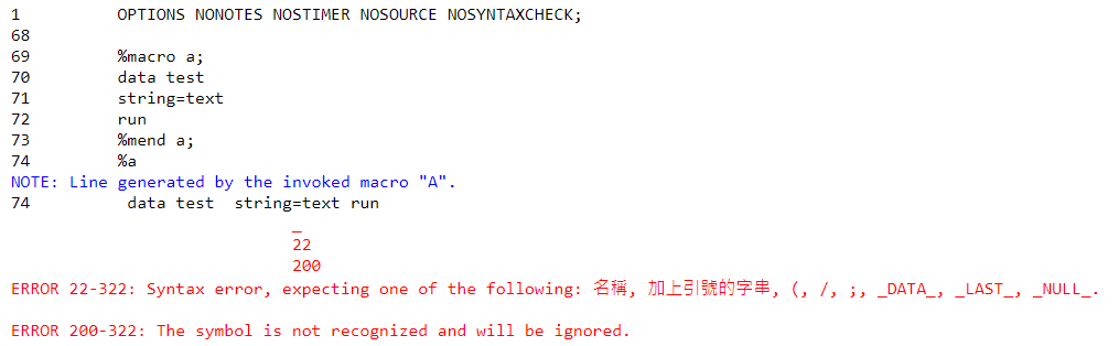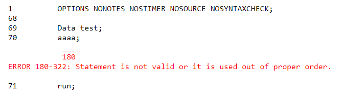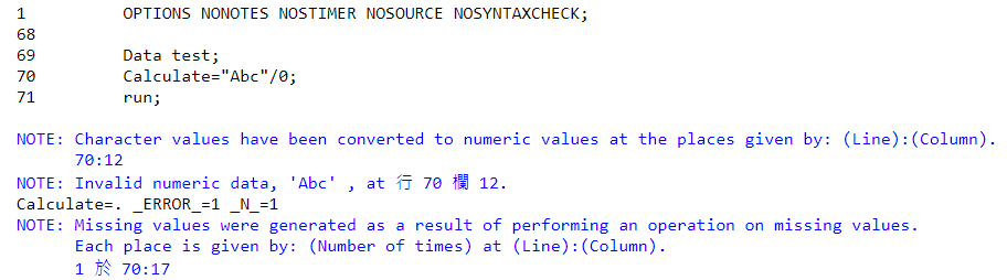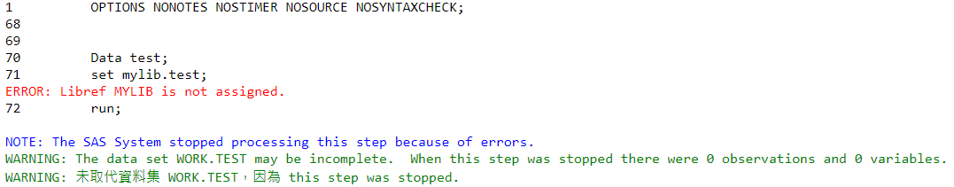 當提交程式後,發生不符規SAS則或是其他條件時自動產生的錯誤資訊,多數情況下程式會被迫停止執行