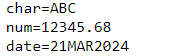 - Char2觀察值的左邊有4個空白,在套用$5.格式後,只會顯示出A的值